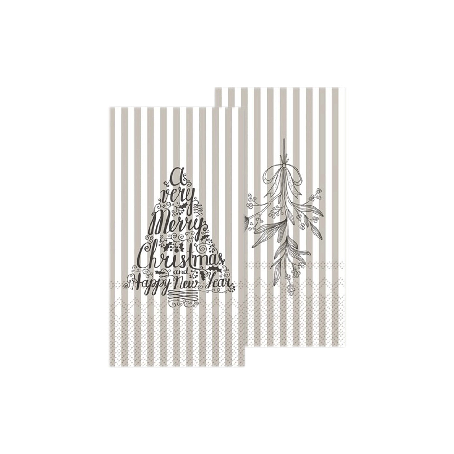 Weihnachtliche Papierserviette beige Weiß gestreift mit einem Mistelzweig auf der einen Seite und auf der anderen ist ein Tannenbaum, gebildet aus den Wörtern "Merry Christmas an a happy new year", zu sehen.