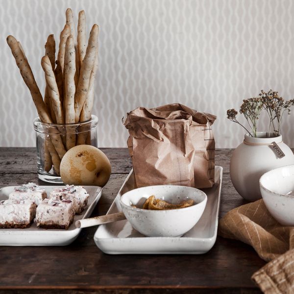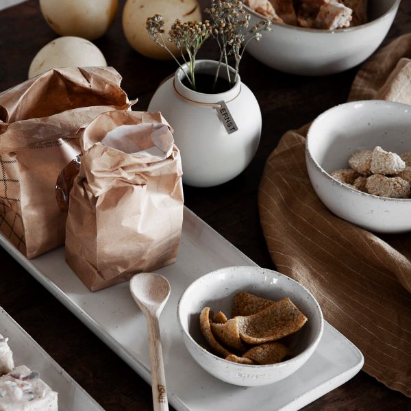 Die Servierplatte von ERNST nach dem Design von Ernst Kirchsteiger, dem bekannten schwedischen TV-Star und Buchautoren, aus glasiertem Steinzeug ist eine dekorative Schale für Obst oder kleine Speisen, die in zwei Größen erhältlich ist. Du kannst sie aber auch hervorragend als Teller nutzen. Die rechteckige Form bringt einen außergewöhnlichen skandinavischen Style und noch dazu mehr Platz auf deinen Esstisch, denn rechteckige Teller nehmen weniger Platz ein als runde.