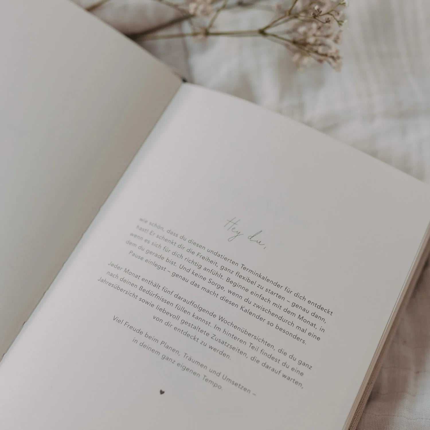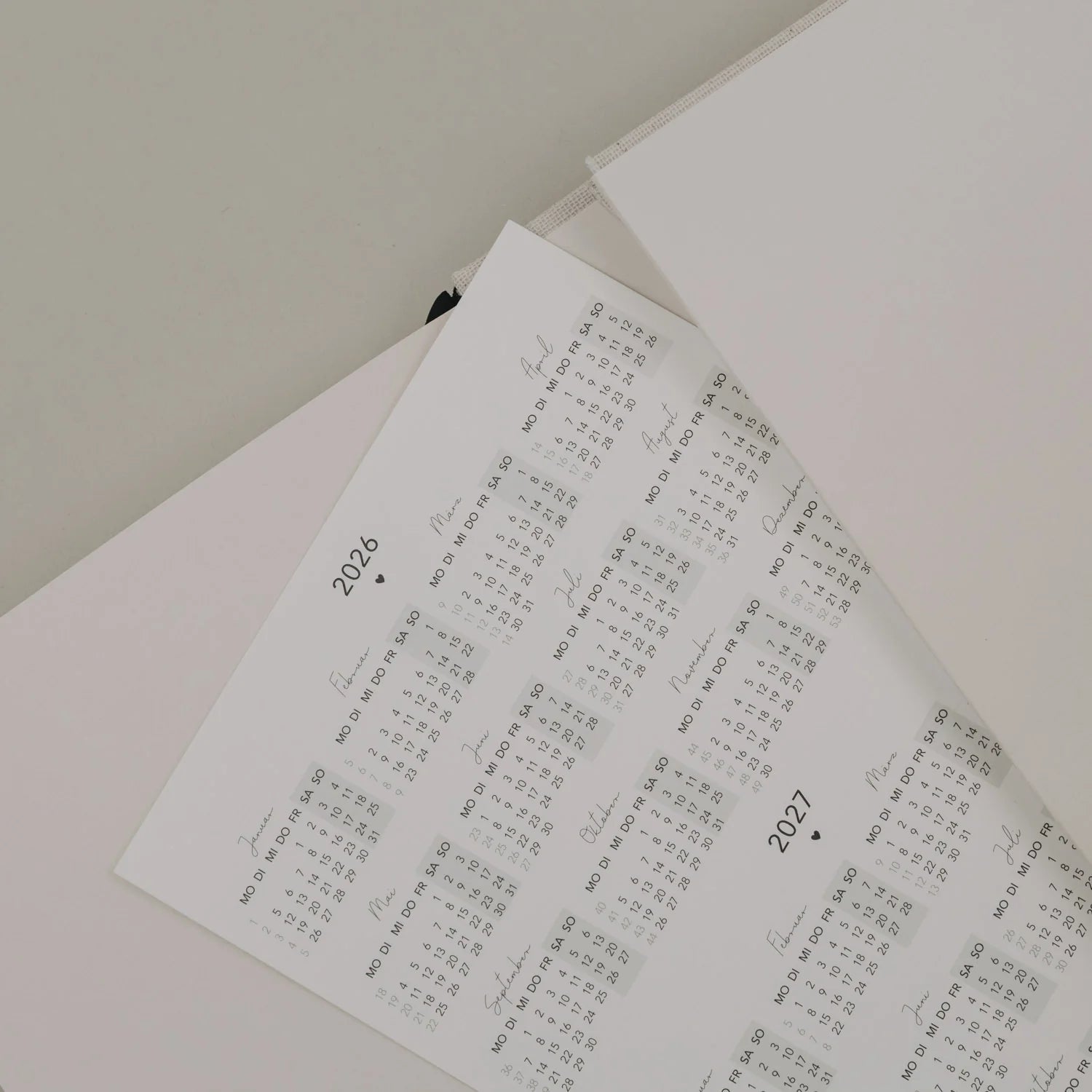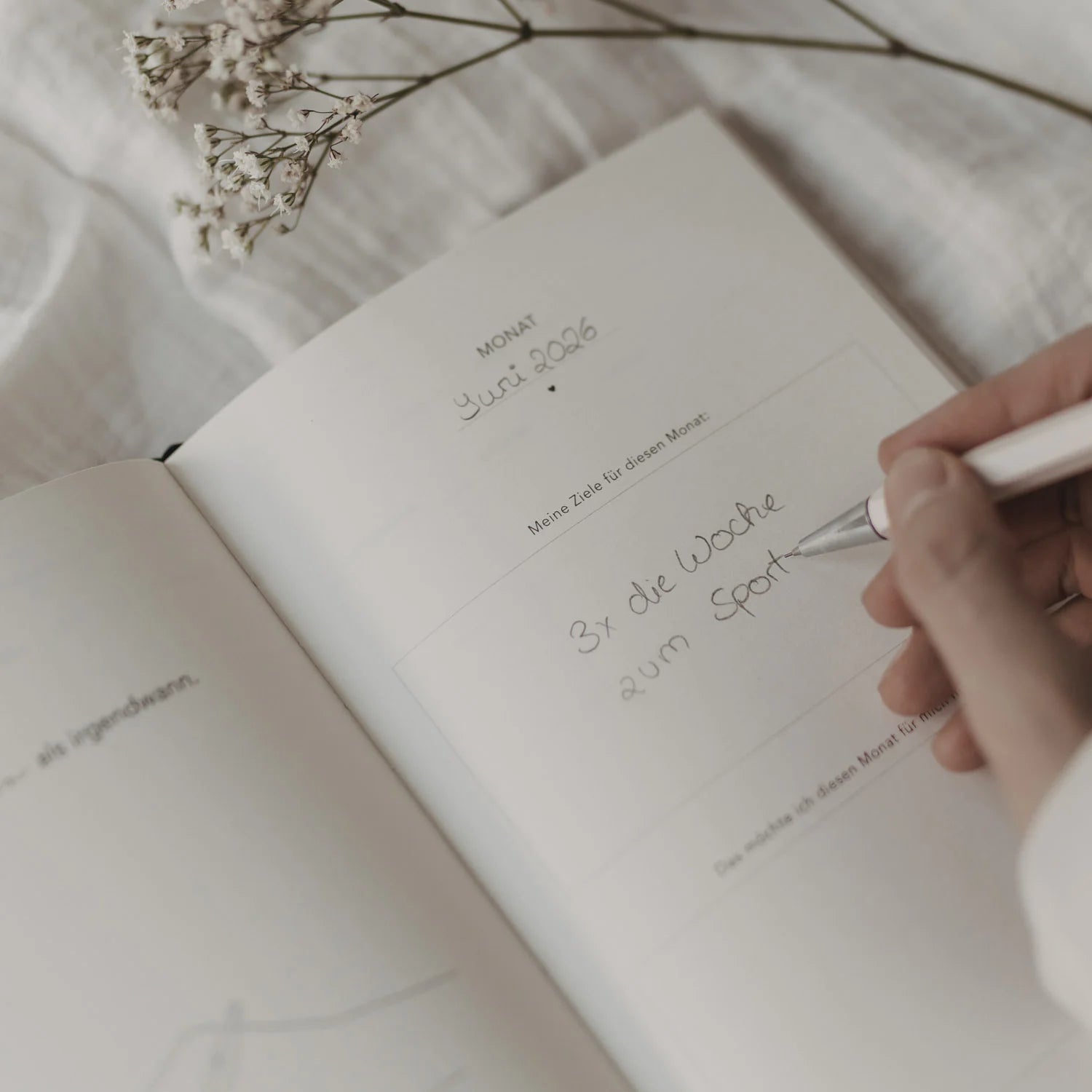Der Kalender begleitet dich durch 12 frei gestaltbare Monate. Jeder Monat bietet Platz für deine persönlichen Ziele und Self-Care-Momente, eine übersichtliche Monatsansicht sowie fünf aufeinanderfolgende Wochenübersichten mit ausreichend Raum für Termine, Notizen und Prioritäten.