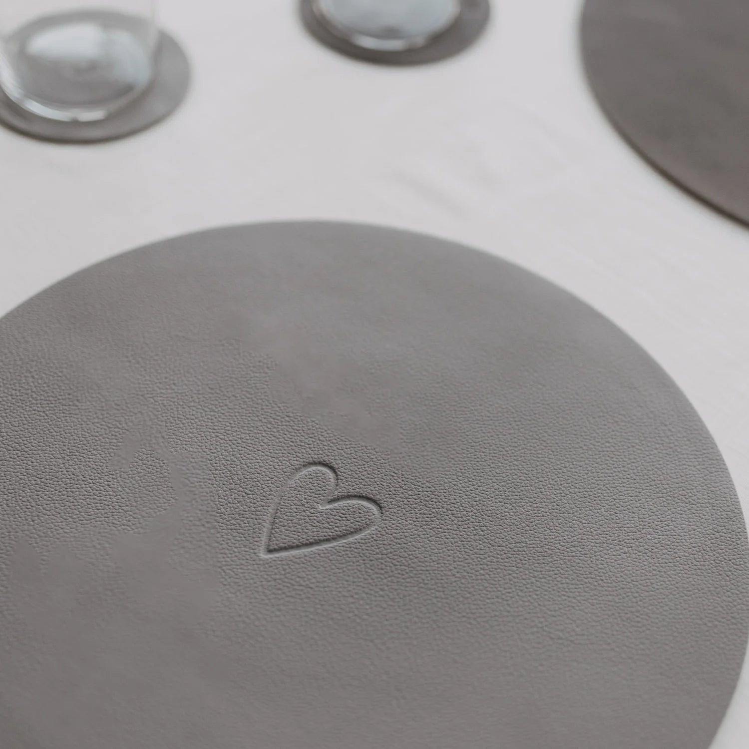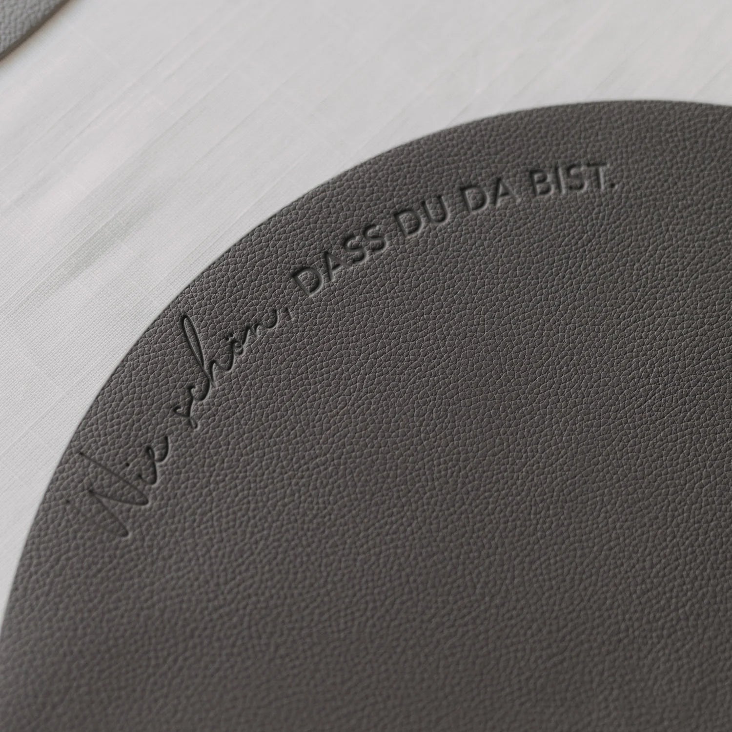 Die Besonderheit: Das Platzset ist beidseitig nutzbar. Eine Seite zeigt sich in einem edlem Anthrazit mit feinem Schriftzug „Wie schön, dass du da bist“. Die Rückseite erscheint in einem weichen, hellen Grauton – mit geprägtem Herzsymbol. Auf der hellen Seite ist zusätzlich der kleine Eulenschnitt-Schriftzug am unteren Rand zu finden. Beide Seiten überzeugen durch ihre ruhige Ästhetik und lassen sich harmonisch mit verschiedenen Tischdekorationen kombinieren.