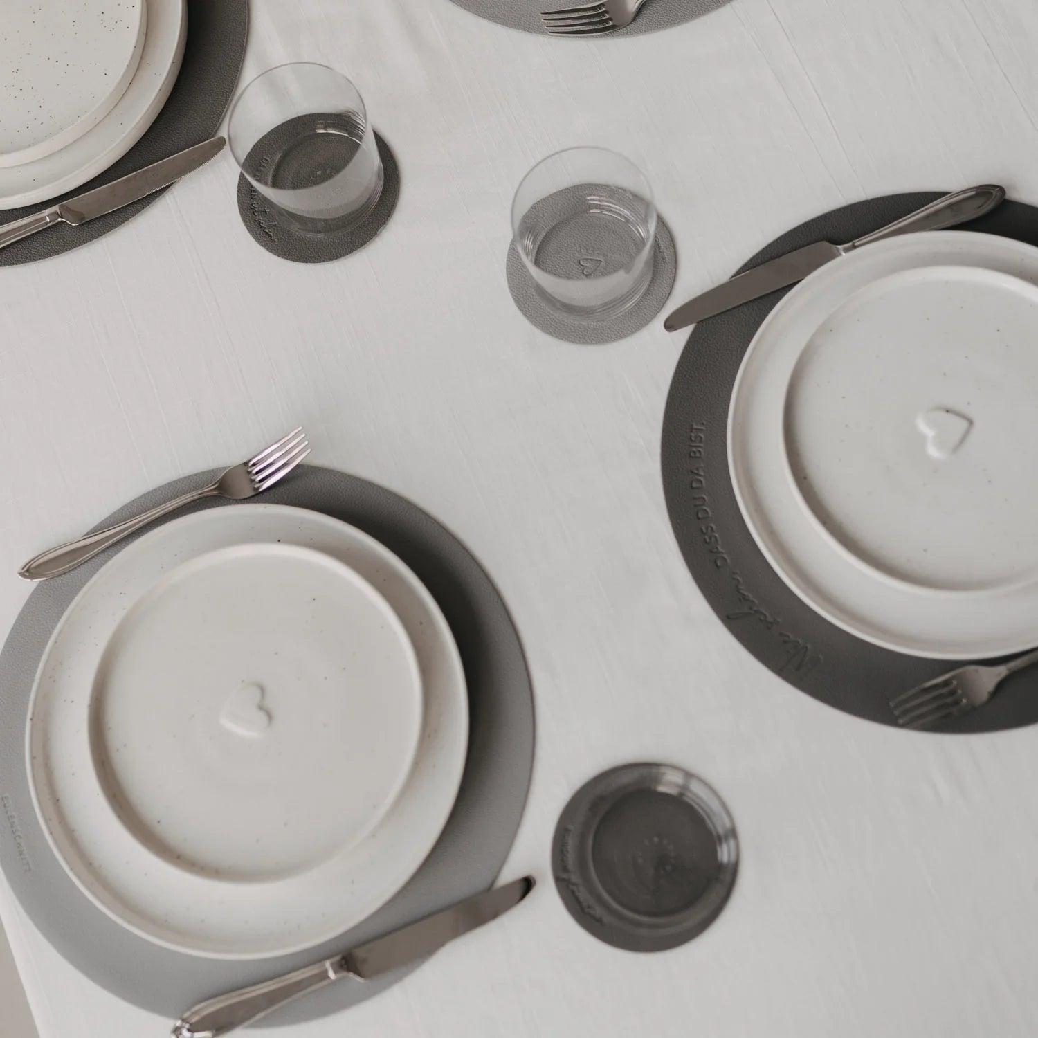 Verleihe deinem gedeckten Tisch eine besondere Note – mit unserem stilvollen, wendbaren Platzset Wie schön Grau. Ob bei einem gemütlichen Frühstück, einem festlichen Dinner oder als dekoratives Element auf dem Sideboard – dieses runde Set bringt in jedem Raum dezente Eleganz und liebevolle Details zum Ausdruck.