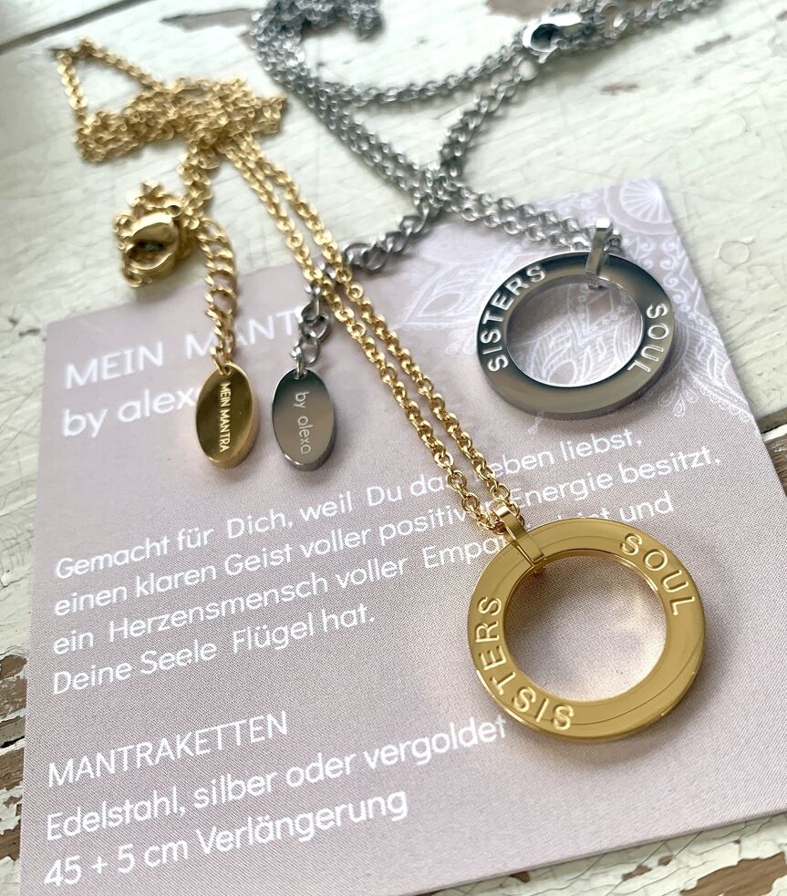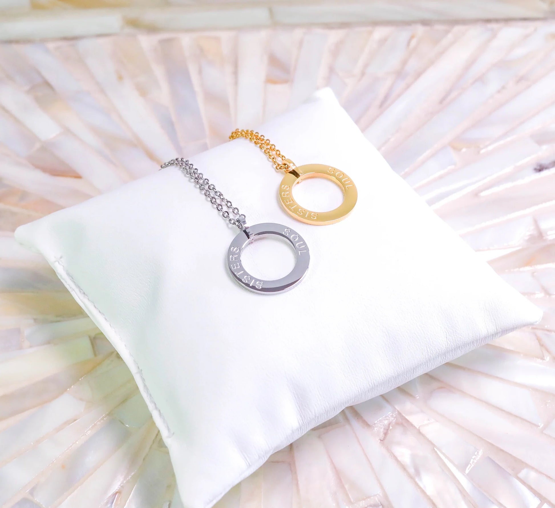 Halskette mit Anhänger mit der Gravur "SOUL SISTERS". Diese elegante Mantrakette aus Edelstahl in Silber oder Gold ist hypoallergen, wasserfest, langlebig und nachhaltig.