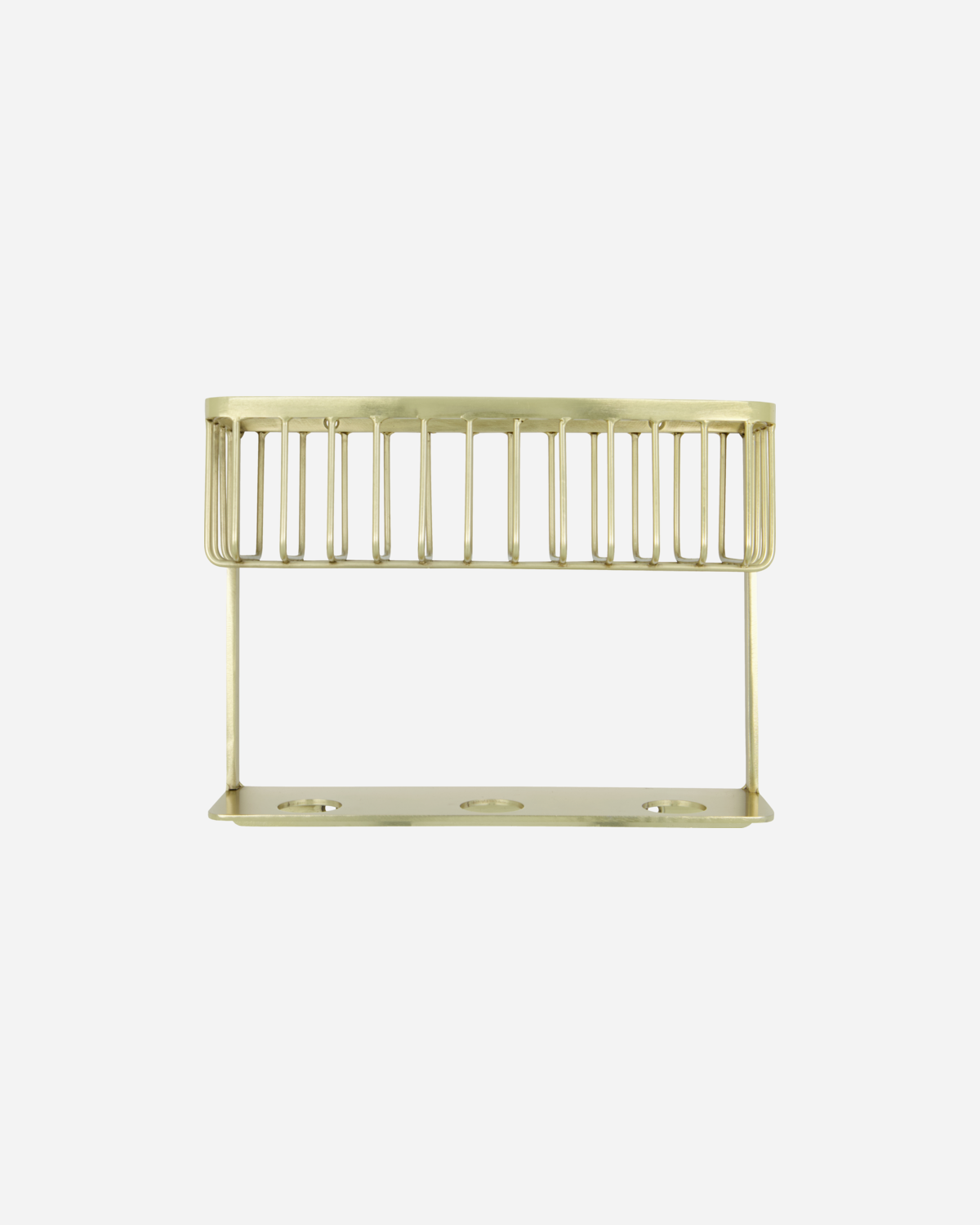 Mit BATH, dem Metallregal von House Doctor, kannst du jetzt im Bad und in der Küche für Ordnung sorgen. Es besteht aus Edelstahl und hat für ein elegantes, zeitloses Aussehen zusätzlich ein Goldfinish erhalten. Das Design mit einem Korb und einem Regal für 3 Flaschen bekommst du optimale Platzbedingungen und kannst auf ideale Weise alles ordentlich aufbewahren: in der Dusche - Shampoo, Spülung, Peelings und Zubehör und in der Küche Spülmittel, Handseife, Desinfektion, Spülbürste, Schwamm und Schwammtuch. Alles immer griffbereit.