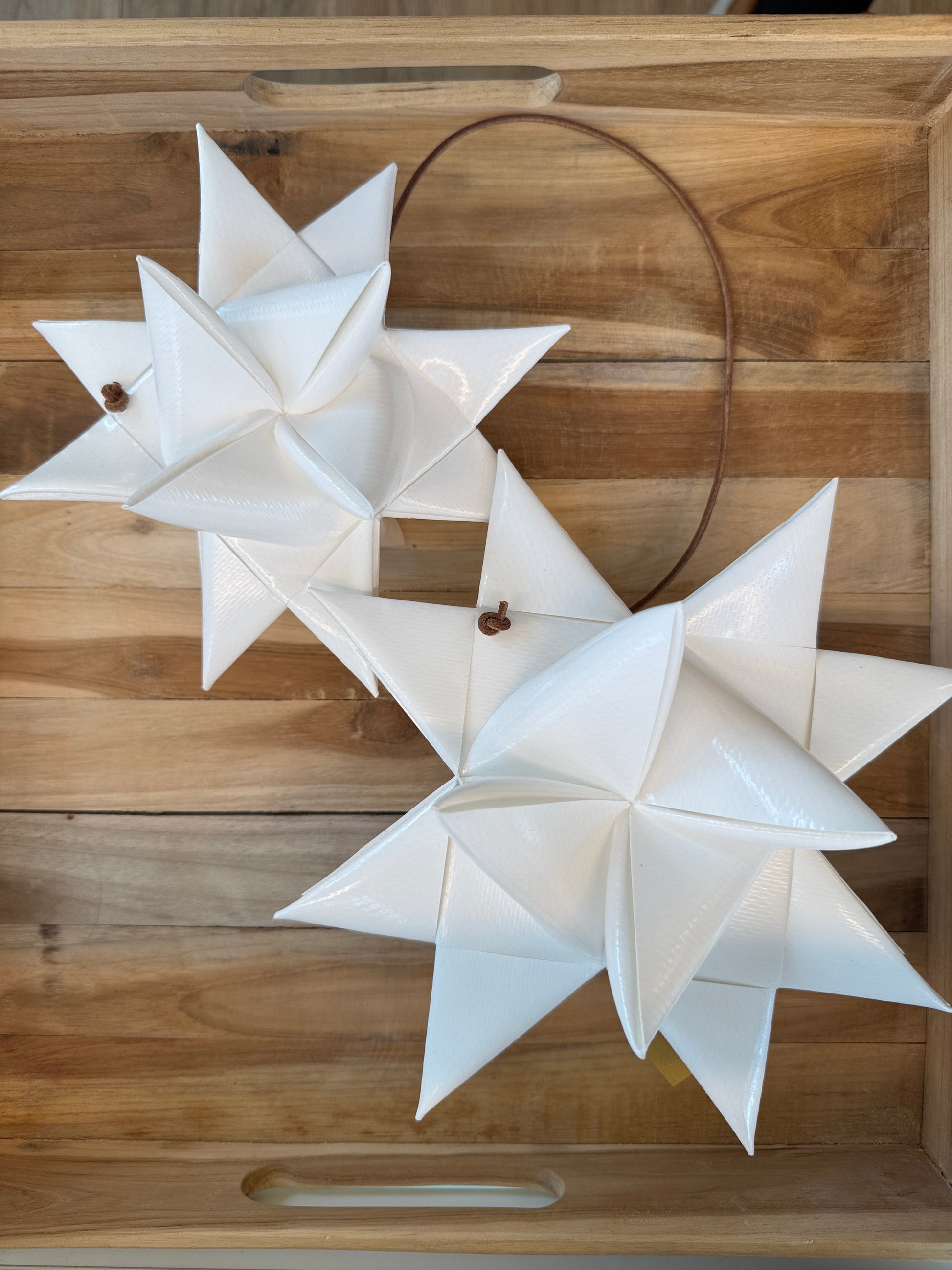 Das Outdoor Fröbelstern Set besteht aus 2 Sternen, die aus robustem Planenmaterial mit einem Polyesterkern und einer PVC-Beschichtung in Handarbeit gefertigt wurden und durch eine dunkelbraune Schnur miteinander verbunden sind. Das stabile Material und die glänzende Oberfläche macht diese Sterne zu einem echten Hingucker und lässt sie jeder Witterrung trotzen. Perfekt für Weihnachtsdekorationen im Innen- und Außenbereich zum Beispiel an einem Kranz, deiner Balkon- oder Terrassentür, der Haustüre oder in einem großen Fenster. Aber auch als Weihnachtsdekoration an einem Schrank oder in einem Baum oder Strauch werden sie alle Blicke auf sich ziehen.