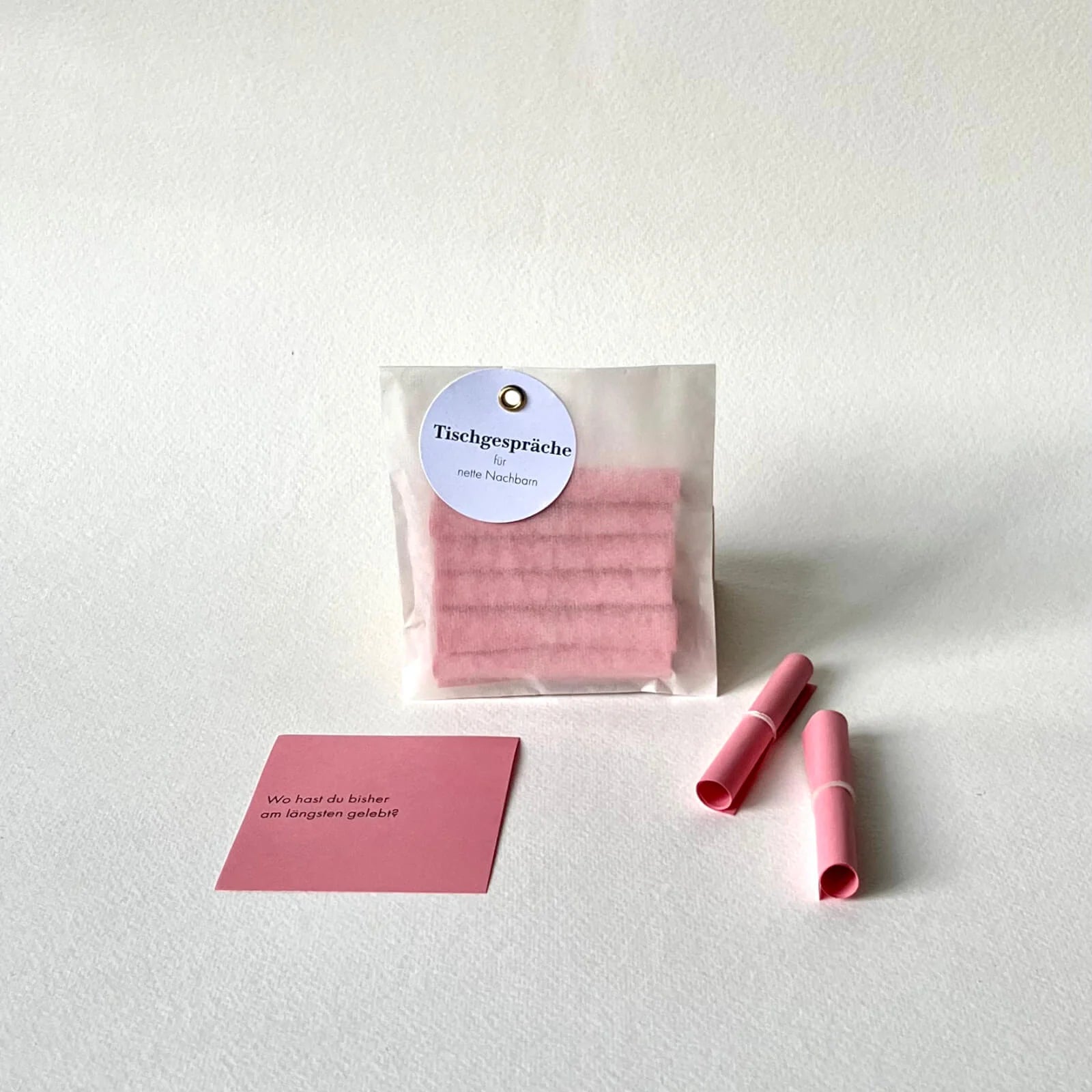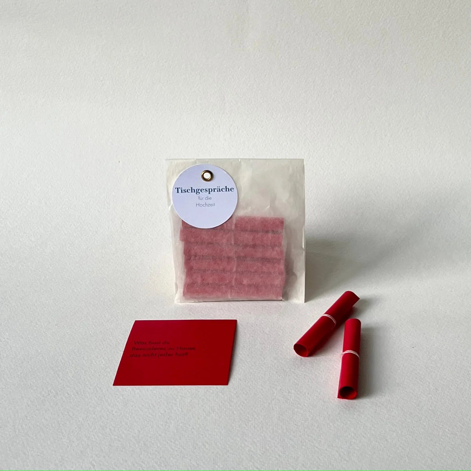 Denkt ihr, dass ihr eure Liebsten bestens kennt? Ihr werdet überrascht sein, wie viel Neues ihr über eure Gesprächspartner erfahrt! Mit den Fragen, die ihr in diesen hübschen Säckchen findet, werden überraschende Antworten auf die Tischplatte gebracht! Völlig unabhängig davon ob man auch ohne diese Kärtchen sich immer was zu erzählen hat. In jedem Beutel findet ihr sechs Röllchen mit jeweils einer Frage.