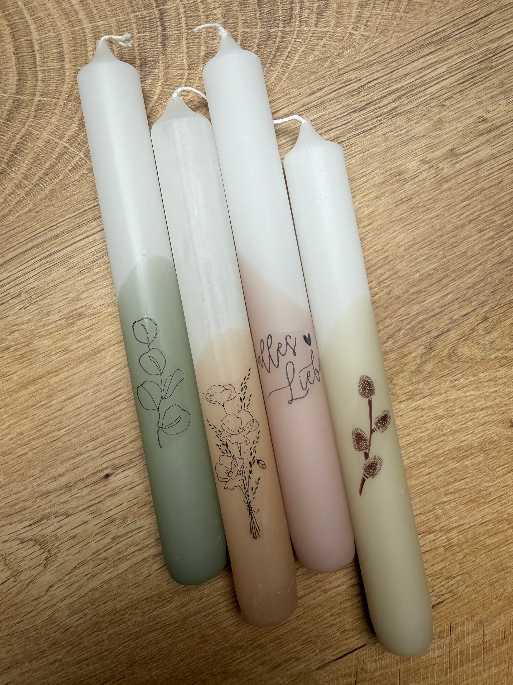Du bekommst ein Set aus verschiedenen Kerzen, die wir gemeinsam in farbigem Wachs tauchen und anschließend zeige ich dir, wie du deine Kerzen mit Stempeln individuell gestalten kannst. Hierfür stehen dir an die 100 Stempelmotive zur Auswahl.